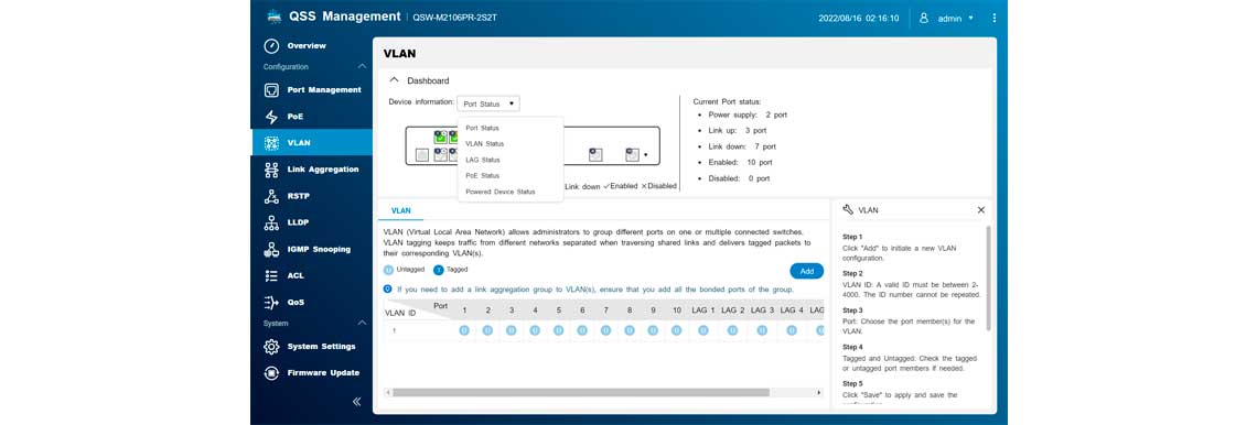 O QSS fornece um painel geral, gestão de portas e guia de configuração para ajudar os utilizadores a controlar as redes de camada 2.