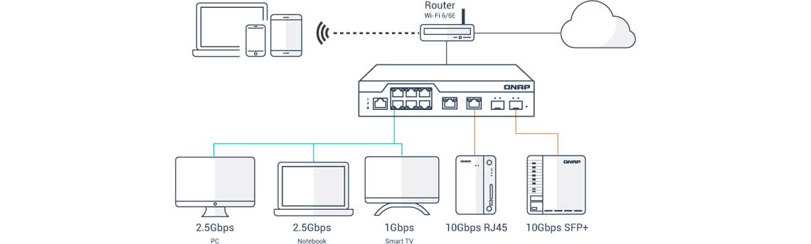 Compatível com várias portas de 10 GbE/2,5 GbE, o QSW-M2106PR-2S2T elimina as limitações de largura de banda das redes com e sem fios a fim de melhorar a experiência de armazenamento e acesso.