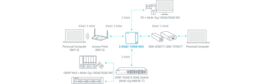 O QSW-M2108-2C é compatível com as tecnologias 10GbE e NBASE-T para oferecer cinco velocidades (10G/5G/2,5G/1G/100M) com cabos Cat 5e e Cat6a existentes.