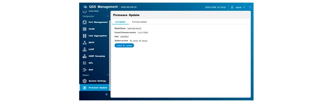 Verificação e atualização de firmware online: Mantenha o QSW-M2108-2S seguro efetuando atualizações de firmware com um clique.