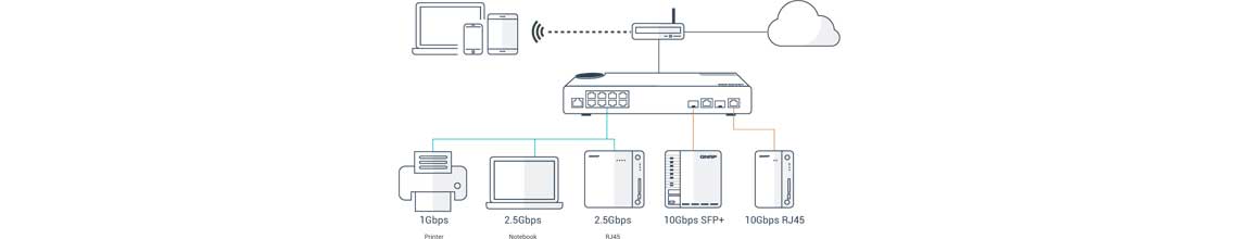 O QSW-M2108-2S da Qnap é um switch gerenciável de 10x portas, sendo 2x portas combinadas SFP+ 10GbE e 8x portas de 2,5 Gigabits. Compatível com a comutação de camada 2 e gerenciamento de rede através de uma interface de usuário na Web fácil de usar e oferece implementação flexível em ambientes de rede híbridos de alta velocidade.