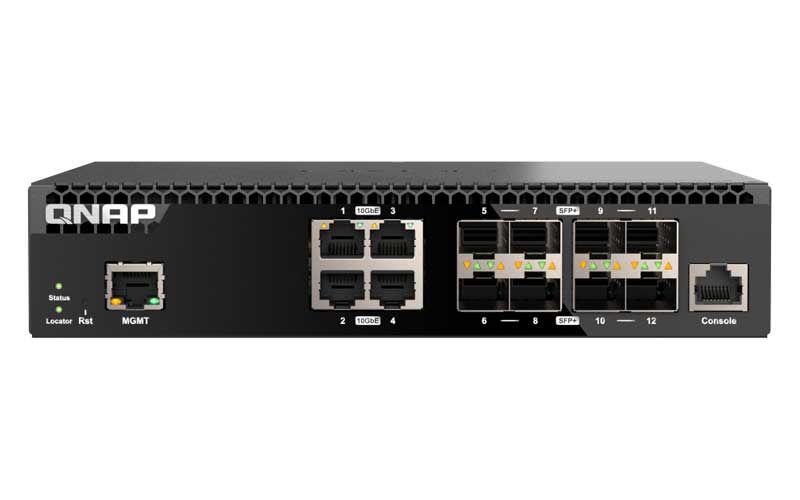O QSW-M3212R-8S4T possui 12x conexões, sendo com 8x portas 10GbE SFP+ e 4x RJ45 10GbE, fornecendo aos usuários SMB e SOHO portas adicionais para conectar dispositivos 10GbE com interfaces diferentes a um preço acessível.