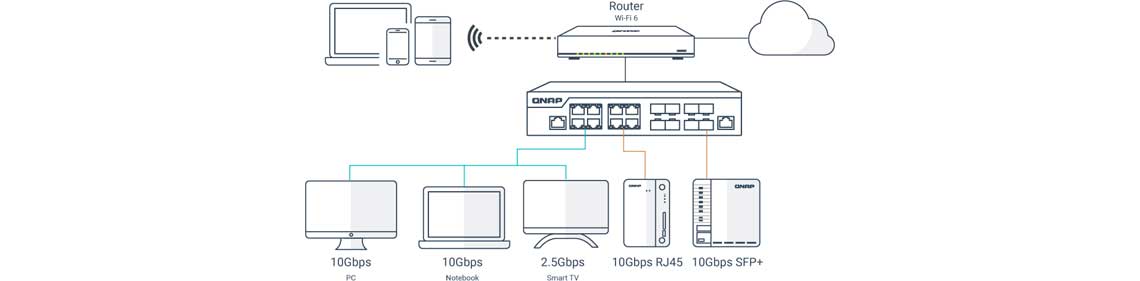 O switch está equipado com interfaces SFP+, que oferecem a flexibilidade de usar cabos DAC (Direct Attach Copper) para conexões diretas com dispositivos SFP+. Além disso, é possível empregar portas RJ45 para conectar dispositivos 10GBASE-T/NBASE-T por meio de cabos de categoria 6.