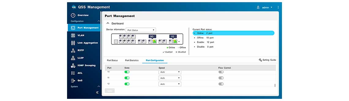O QSS fornece um painel geral, gestão de portas e guia de configuração para ajudar os utilizadores a controlar as redes de camada 2.