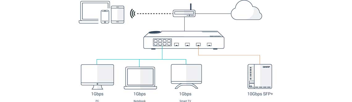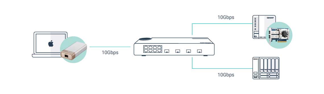 Todos eles podem ser usados com o QSW-M408S para criar um ambiente de rede abrangente de alta velocidade para aumentar o desempenho da edição de fotos/vídeos, virtualização, transferências de arquivos grandes e outras tarefas que demandam alta largura de banda.