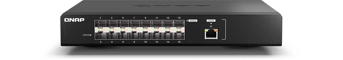 O QSW-M5216-1T da Qnap é um switch gerenciável com 17 portas, composto por 16 conexões de alta velocidade 25GbE / SFP28 e uma entrada adicional de 10GbE NBASE-T. Sua interface de gerenciamento de rede é amigável e adequada até mesmo para profissionais que não têm conhecimento em TI.