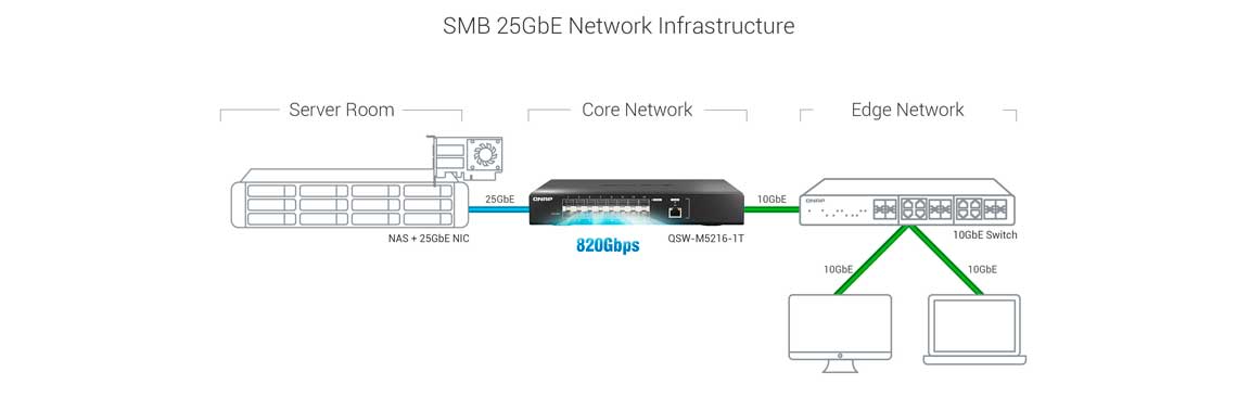 O switch oferece capacidade de comutação de backbone de 820Gbps, garantindo todo o potencial de cada porta. O QSW-M5216-1T pode servir como switch principal de uplink para servidores 25G/100G e NAS em salas de servidores ou conectar a switches de fibra de ponta 25G/10G.