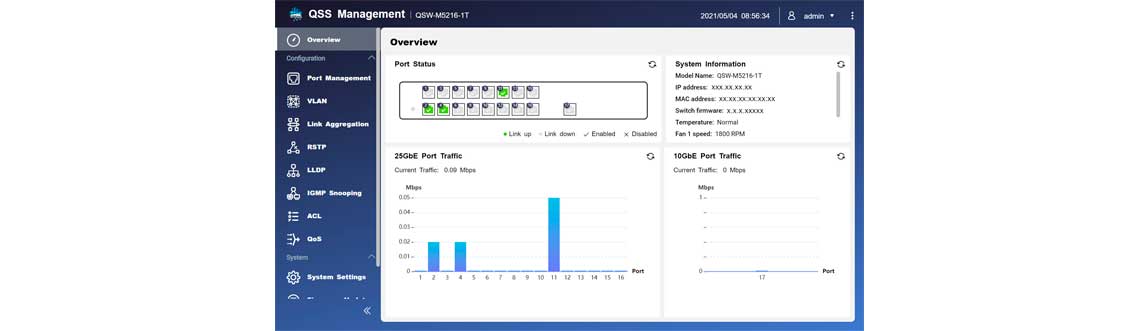 O QNAP Switch System (QSS) oferece uma interface de usuário baseada na web com recursos de valor agregado para tornar a configuração e a administração da rede mais simples.