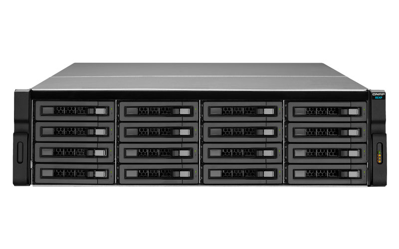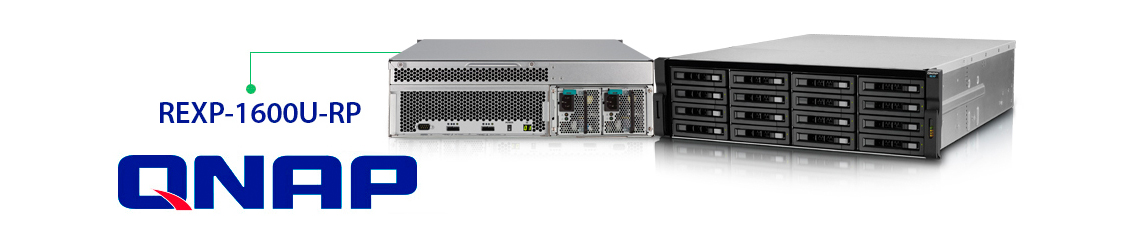 O Qnap REXP-1600U-RP, com formato 3U espaço em rack, possui 16 discos rígidos e oferece 2 portas SAS de entrada e saída, via o cabo mini SAS é possível ligar a unidade de expansão, realizando conexão em cadeia.