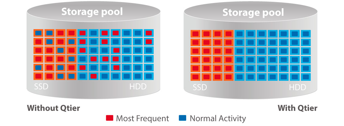 Tecnologia Qtier: Capacita o storage NAS com auto tiering que ajuda a otimizar a eficiência de armazenamento, transferindo automaticamente os arquivos entre SSDs e HDDs com base na frequência de acesso. O Qtier 2.0 apresenta reconhecimento de I/O que permite o armazenamento em camadas SSD com espaço reservado parecido com cache para lidar com I/O em tempo real.