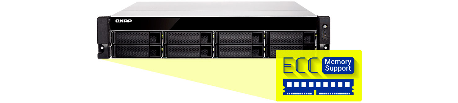 O TS-883XU-RP pode detectar e corrigir erros de memória de um único bit assim que ocorrem para evitar o tempo de inatividade e perda de dados. O storage NAS suporta memória DDR4 dual-channel em 4 slots Long-DIMM. Possibilita a personalização da configuração de memória (suporta até 64GB de RAM) do NAS para obter um desempenho maior para aguentar cargas de trabalho que mudam dinamicamente, como virtualização.