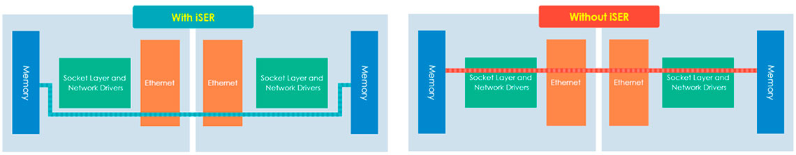 Através das 2 portas 10GbE SFP+ que utilizam o controlador SmartNIC Mellanox ConnectX-4 Lx, o Qnap TS-883XU-RP suporta protocolo iSCSI Extensions for RDMA (iSER), permitindo que os dados ignorem os drivers gerais de rede, camada de soquete e entrar diretamente nos buffers de memória do servidor ESXi e no armazenamento para descarregar as cargas de trabalho da CPU. Com o servidor VMware e o storage NAS 112TB suportando iSER, o desempenho de leitura / gravação é elevado até 60% e até 50% de latência é reduzida, proporcionando uma ferramenta para otimização de aplicativos de virtualização.