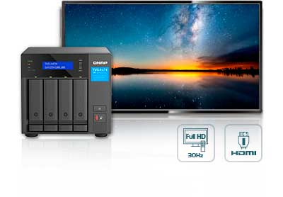 Saída HDMI: O TVS-h474 possui saída HDMI que suporta Full HD, oferecendo grandes benefícios para aplicações como produção/edição de vídeo ou design que exigem alta resolução e armazenamento de mídia intensivo, transferência e exibição.