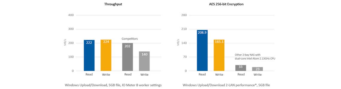 Com rápido desempenho nas tarefas de criptografia AES-256 bits em volumes, o storage 2 discos TS-253 Pro oferece velocidades de transferência até 70MB/s, aumentando a segurança do sistema e assegurando confidencialidade nos dados armazenados.