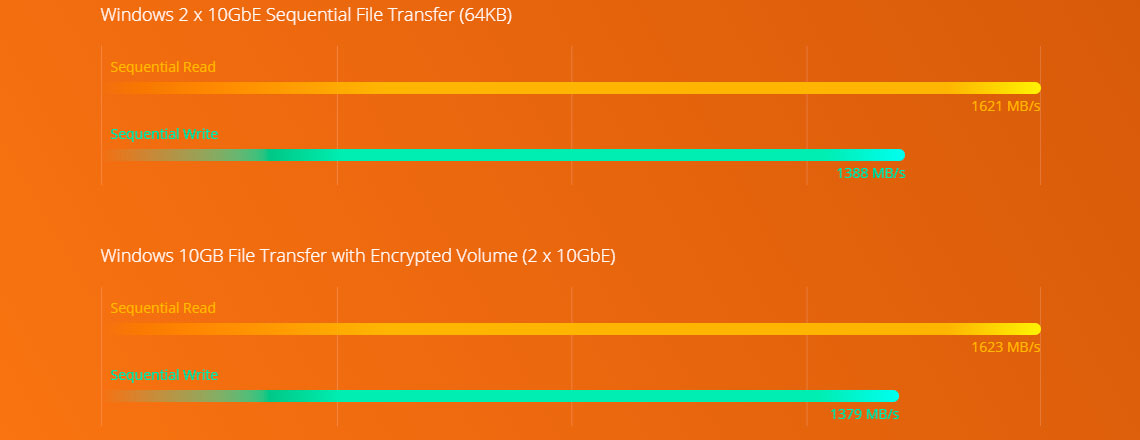 Utilize criptografia AES-NI proporciona velocidades até 1623MB/s de leitura e 1379MB/s de gravação, o server NAS oferece alto desempenho para atender às demandas multitarefas.