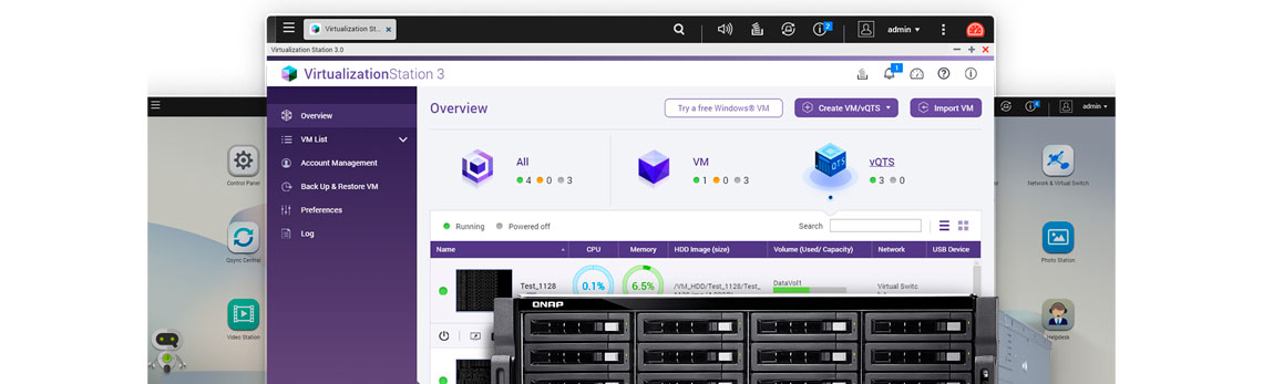 Com base no Virtualization Station, o QTS permite a criação de sistemas QTS virtuais isolados para fornecer benefícios para separação de recursos, ambientes com vários alocados e implementação flexível de aplicativos. Também pode auxiliar na otimização do uso de energia, custos e espaço físico.