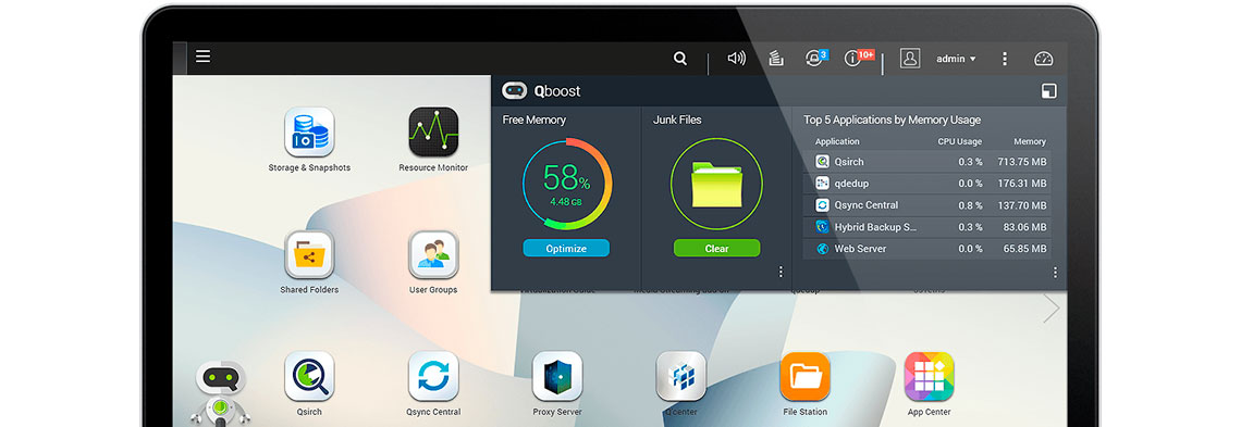 O QTS apresenta múltiplas aplicações e funções modularizadas, aumenta a eficiência do gerenciamento, produtividade pessoal, multimídia e muito mais, possibilitando uma experiência mais eficiente e flexível para os usuários.