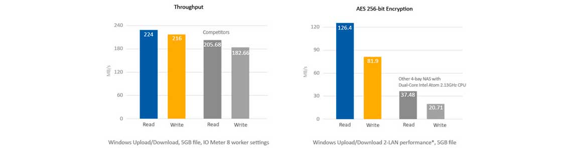 Além disso, o storage 4 discos Qnap aumenta automaticamente a velocidade do processador de 2.41GHz para 2.58GHz em tarefas de uso intensivo da CPU. A criptografia habilitada proporciona velocidades de transferência até 68MB/s, com volume AES-256 bits, proporcionando desempenho e garantindo segurança de dados armazenadas.