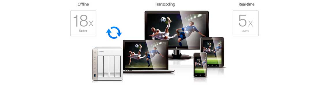 O storage proporciona transcodificação de vídeos Full HD para exibição de vídeos em formatos facilmente reproduzidos em computadores, dispositivos móveis e SmartTVs. Com aceleração gráfica em hardware, o storage permite até 5 dispositivos exibir simultaneamente diferentes vídeos armazenados.