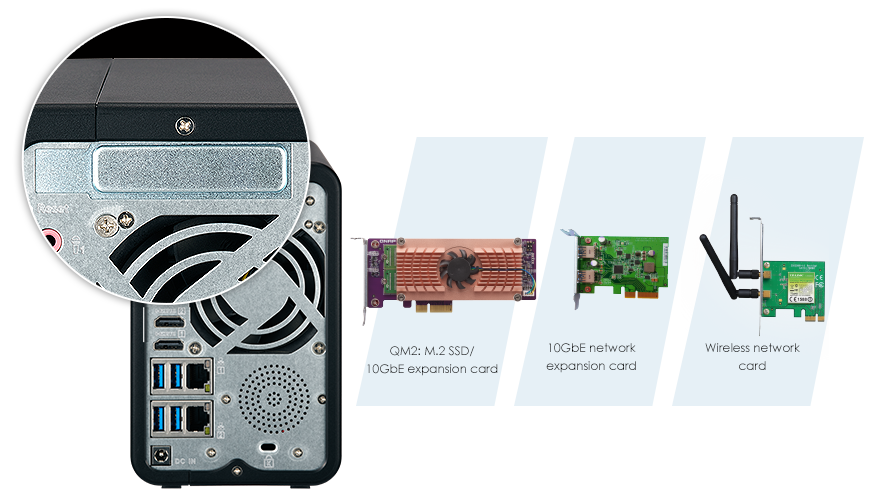 Além disso, possui um slot PCIe disponível para impulsionar as aplicações NAS, dando a possibilidade de instalação de uma placa QM2 que adiciona conectividade 10GbE e slots M.2 SSD, uma placa compatível para conexão sem fio ou uma placa para conexão USB 3.1 10Gbps para facilitar o backup de/para dispositivos externos.