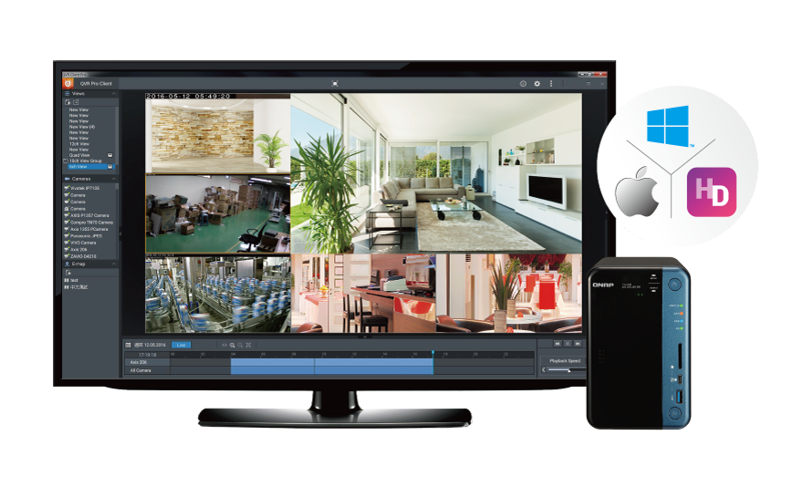 O QVR Pro possui interface de monitoramento versátil que otimiza a visualização de câmeras de vigilância, permite busca de vídeo por timeline e reprodução sem mudar de janela. Funções adicionais incluem adição e edição de câmeras, busca de dispositivos IP em diferentes LANs.