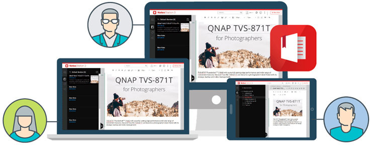 O aplicativo Notes Station permite que os usuários escrevam documentos em conjunto, permitindo alterações e mantendo o histórico de revisão dos documentos, além de oferecer uma ferramenta para edição de imagens, possibilitando criar documentos melhores e criar links para compartilhar documentos em tempo real. O recurso de criptografia garante segurança e impede o acesso não autorizado aos dados e o backup por snapshots possibilita reter diferentes versões de documentos gravados ao longo do tempo. Funções como importação/exportação de arquivos e backup de site completo, Notes Station, permitindo inclusive backup de documentos para outro NAS local ou serviços de cloud.