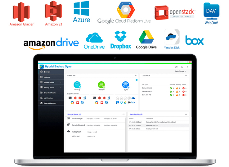 50TB de backup e sincronização com serviços de nuvem, é isso que o servidor de backup Qnap permite. O aplicativo incorporado Hybrid Backup Sync unifica as funções de backup, restauração e sincronização (através de RTRR, rsync, FTP e CIFS/SMB) num único aplicativo, transferindo dados para ambientes locais, remotos e armazenamento cloud. Os serviços cloud suportados incluem Amazon Glacier, Azure Storage, Google Cloud Storage, Google Drive, Microsoft OneDrive, Dropbox, Amazon Drive, Yandex Disk, Box e Amazon S3 / OpenStack Swift / WebDAV. Hybrid Backup Sync suporta backup de várias versões, agendamento de tarefas, compactação de arquivos e muito mais.
