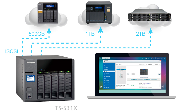 Caso 50TB não seja suficiente, o TS-531X permite através dos serviços iSCSI e a integração do VJBOD, expansão de armazenamento via outros storages Qnap que possuam espaço ocioso. O VJBOD (JBOD Virtual) é um JBOD baseado em rede que permite expandir o armazenamento de um storage NAS Qnap utilizando outras unidades NAS com áreas livre e estejam na mesma rede. O storage 50TB Qnap permite assim uma utilização racional de outros storages via VJBOD, criando pools de armazenamento virtual e volumes em discos virtuais, melhorando a produtividade de toda infraestrutura de rede.