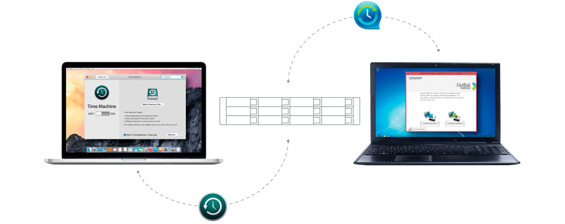 Preparado para lidar com funções de backup de dados em Windows e Mac, o TS-432XU conta com o utilitário de backup NetBak Replicator da Qnap para usuários Windows e oferece compatibilidade com o Time Machine para usuários Mac, podendo ser configurado diretamente no servidor de backup Qnap.