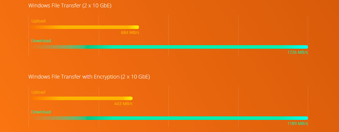 Com criptografia de volume AES-256 acelerada por hardware, o NAS proporciona velocidades de até 1189MB/s de leitura e até 443MB/s de gravação, além disso, a conectividade de 10GbE e expansão via slot PCIe, possibilita fornecer desempenho de até 1726MB/s de leitura e até 684MB/s de gravação.