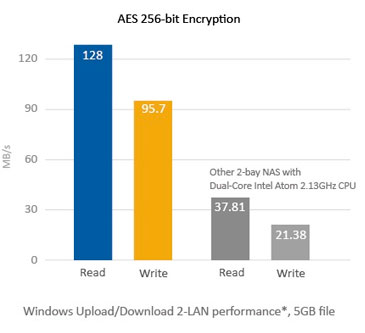 Além disso, o recurso Burst-Up do Qnap aumenta automaticamente a velocidade do processador de 2.41GHz para 2.58GHz em tarefas que exigem uso intensivo da CPU. O desempenho com criptografia habilitada atinge velocidade de transferência até 68MB/s com volume AES-256 bits, assegurando segurança e performance.
