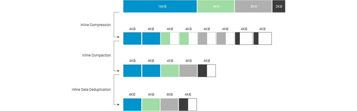 A redução de dados melhora a eficiência e o desempenho do armazenamento: A desduplicação, compressão e compactação de dados em linha diminuem o tamanho do arquivo para otimizar o desempenho e a capacidade de armazenamento.