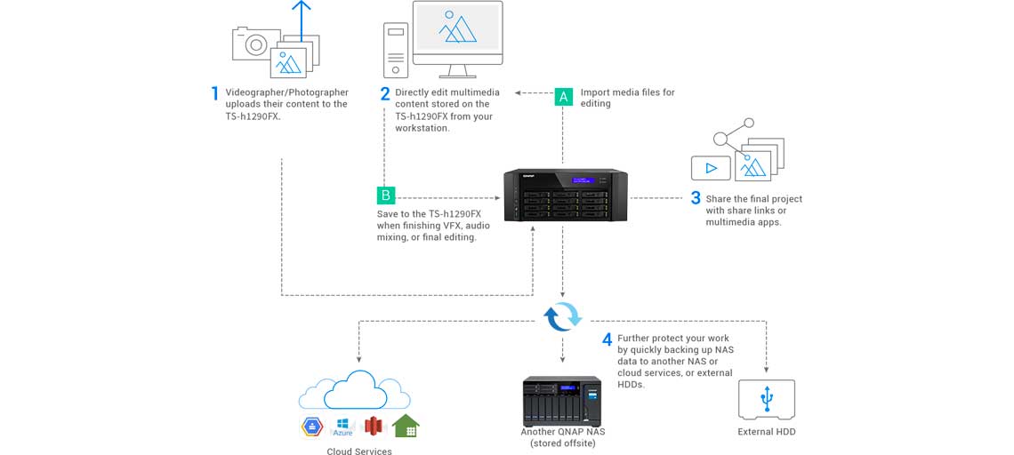 O TS-h1290FX Qnap é ideal para equipes de edição de vídeo, pois é compatível com soluções de software convencionais, incluindo Adobe Premiere Pro, Final Cut Pro X, Avid Media Composer e DaVinci Resolve, para tarefas que exigem largura de banda, como edição de vídeo 4K/8K ou edição colaborativa.