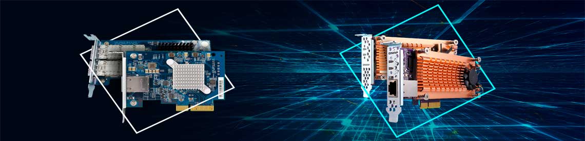 Placas de rede 2.5/5/25/40/100GbE: Habilite uma rápida taxa de transferência para tarefas que exigem largura de banda (virtualização, transmissão massiva de dados, backup/restauração rápidos). É possível emparelhar uma placa de rede 100GbE com um switch Qnap de 25GbE e um QSFP28 a cabos SFP28 para 4x portas de 25GbE no switch.