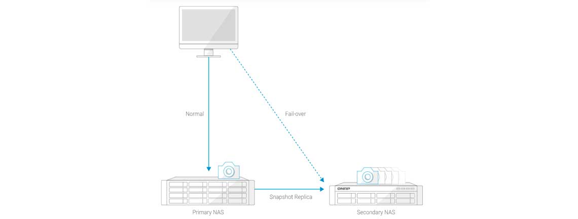 Efetue cópias de segurança de snapshots: Multiplique a proteção de dados ao efetuar cópias de segurança de dados de snapshots. Replique snapshots de volume/LUN no TS-h1290FX para um NAS remoto (Snapshot Replica), copiando apenas as alterações efetuadas. Isto pode poupar tempo e largura de banda, podendo ser executado manualmente ou de forma programada.