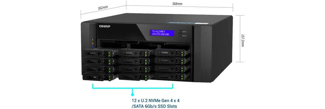 O TS-h1290FX Qnap possui 12x slots SSD que suportam SSDs U.2 NVMe PCIe Gen 4 x4 de alto desempenho ou SSDs SATA6Gb/s econômicos.