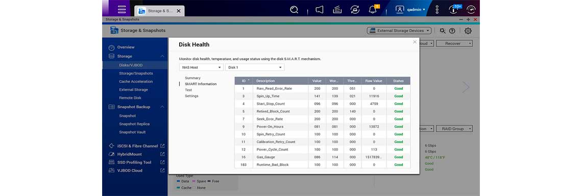 Os usuários podem monitorar a integridade do sistema e gerenciar o uso de SSD no QTS Storage & Snapshots Manager. O SSD M.2 instalado no QDA-UMP4 é hot swappable.