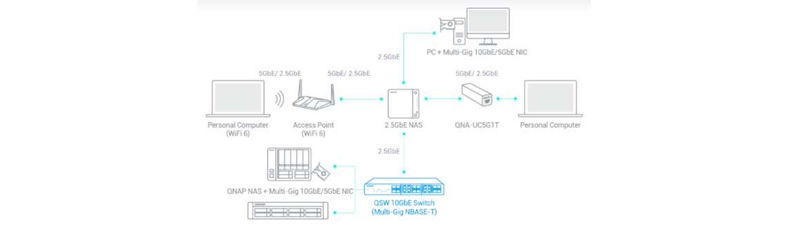 Switches 2,5 GbE+: Os switches 10GbE / NBASE-T QNAP suportam 10G/5G/2,5G/1G/100M e permitem conectar vários computadores e estações de trabalho em ambientes com muitos dispositivos.
