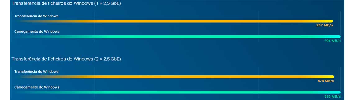 Com duas portas de 2,5GbE, o NAS oferece um desempenho excecional de transferência de arquivos e, com Port Trunking, pode atingir velocidades de até 5Gb/s.