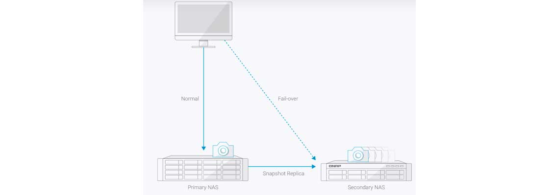 Backup de snapshots: Multiplique a proteção de dados ao efetuar backup de dados com snapshots. Replique snapshots de volume/LUN no TBS-464 para um NAS remoto, copiando apenas as alterações, manualmente ou de forma automática.