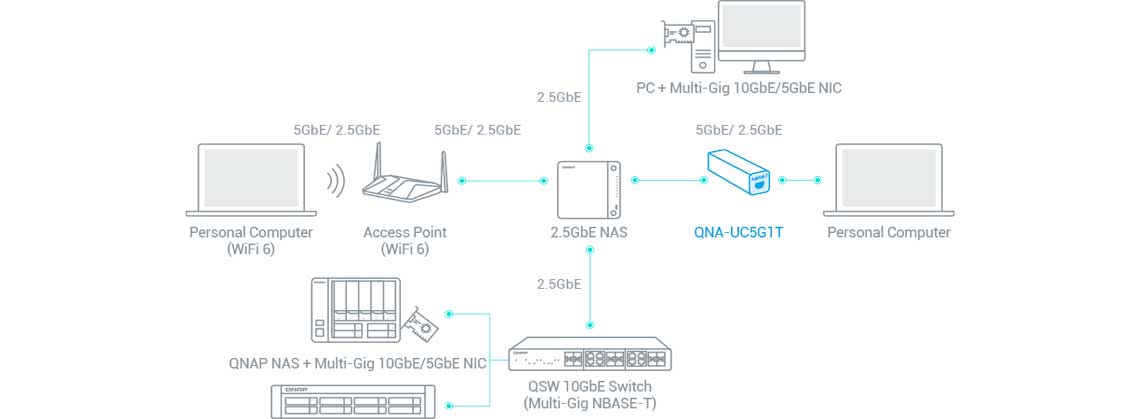 Adicione uma porta de 5GbE a dispositivos portáteis: Computadores com capacidade de melhoria limitada podem utilizar o adaptador portátil USB 3.2 para 5 GbE da QNAP, que lhe permite ligar-se a redes 5G/2,5G/1G/100M através de USB.