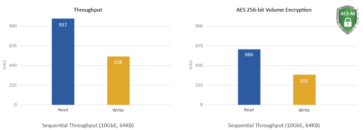 O mecanismo de criptografia por hardware AES-NI fornece desempenho até 666MB/s com criptografia de volume NAS AES 256 bits, garantindo a segurança do sistema e dados armazenados.