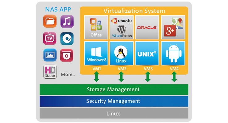 A tecnologia de virtualização AMD-V transforma o TVS-663 Qnap numa estação de virtualização que suporta vários sistemas operacionais, criação rápida de máquinas virtuais (VM), importação/exportação de VM, snapshot e permite operações de desktop em navegadores web.