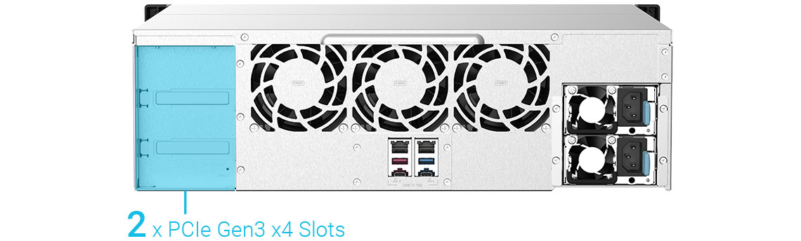 O storage TS-1673AU-RP possui dois slots PCIe Gen 3 x8, que permite incluir funcionalidades adicionais através de uma placa PCIe compatível. Utilizando um adaptador adequado, a bifurcação PCIe é suportada, permitindo que o usuário use duas placas PCIe Gen 3.