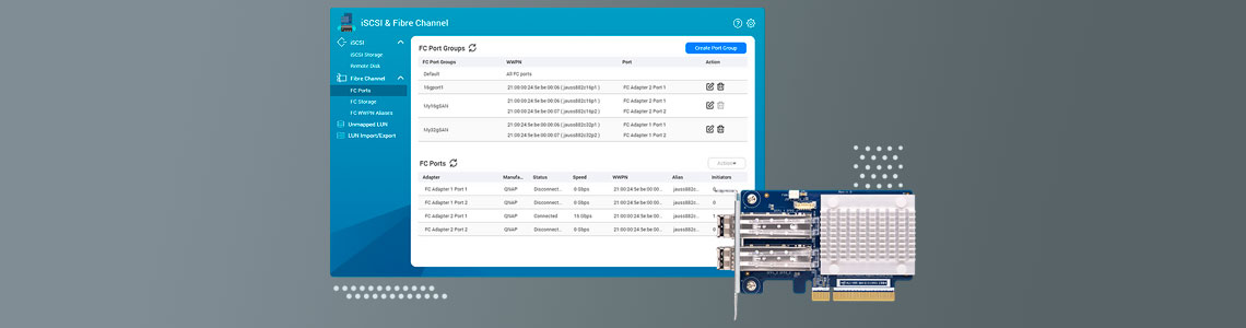 Ao instalar uma placa Fibre Channel QNAP de 16 Gb (QXP-16G2FC 16 Gb) no NAS TS-1673AU-RP, o usuário pode definir um destino Fibre Channel através do aplicativo iSCSI e Fibre Channel. Além disso, os recursos de vinculamento de porta e mascaramento de LUN fornecem uma camada adicional de segurança de dados.