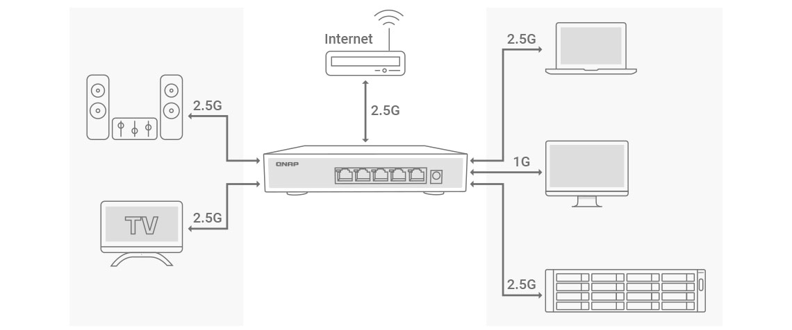 A conectividade de 2,5GbE fornece melhorias perceptíveis através do QSW-1105-5T (switch não gerenciável com cinco portas de 2,5GbE, retrocompatível com 1G/100M) e suporte de cabos CAT5e para conectar vários computadores e outros NAS.