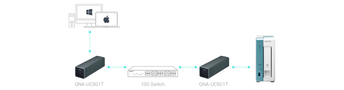 O usuário pode utilizar adaptadores USB 3.2 Gen 1 para 5GbE da Qnap (QNA-UC5G1T) junto com o TS-131K ou em uma máquina. Ao conectar o NAS e o PC usando os adaptadores 5GbE, é criada uma conectividade de rede 5GbE para aproveitar quase 300 MB/s de velocidade de transferência.