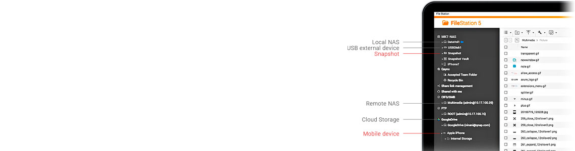 O File Station permite gerenciar arquivos armazenados no Qnap NAS usando um espaço na nuvem, um leitor de cartões USB e dispositivos móveis. O usuário pode facilmente acessar todos os seus dados em um único aplicativo.