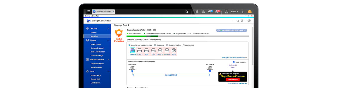 Se um arquivo for acidentalmente apagado ou modificado, o usuário pode usar os snapshots do 'Gerenciador de Armazenamento' e do 'Gerenciador de snapshot', assim como o File Station para restaurar rapidamente o arquivo para o estado gravado anteriormente, além de serem baseados em blocos e só grava os dados alterados.