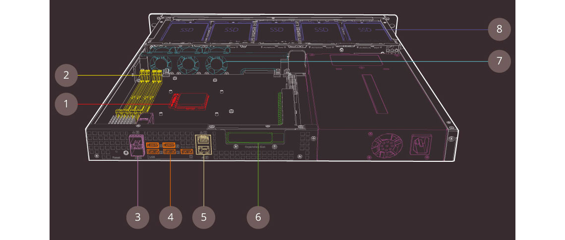 O TS-977XU suporta memória DDR4 de canal duplo e possui 4 slots Long-DIMM. Ao usar módulos de memória emparelhados, o servidor aproveita o poder da arquitetura de canal duplo para aumentar o desempenho.